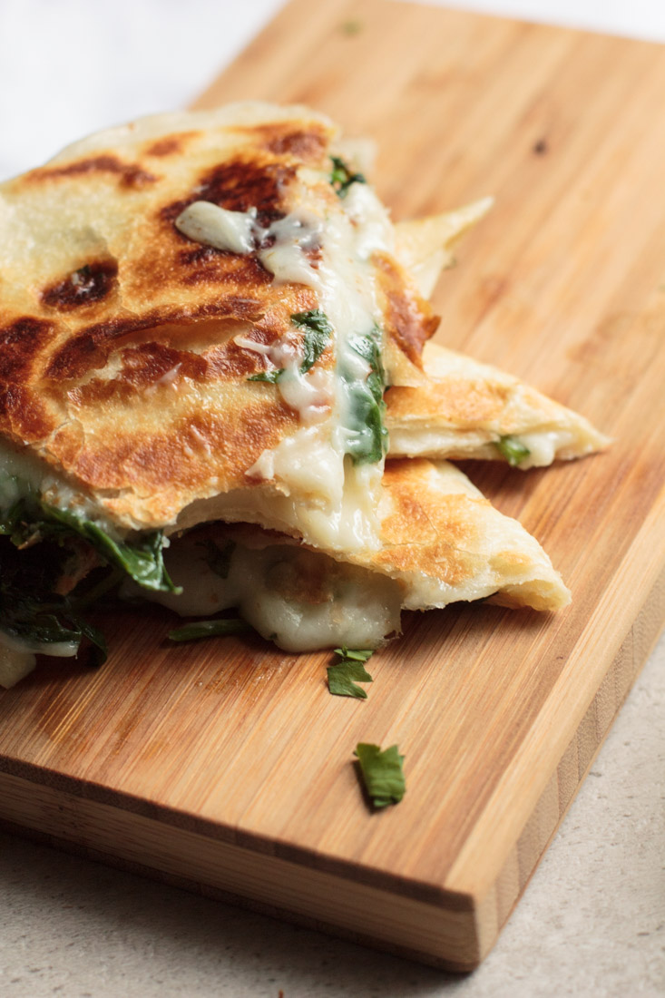 Happy Friday, folks! I’m super excited about today’s recipe. It’s gooey, cheesy and delicious and incredibly simple to make. These spinach quesadillas have only 4 ingredients!