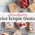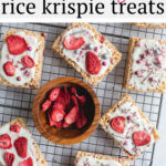 These delightful rice krispie treats taste just like the classic, but with a few twists! Freeze dried strawberries are swirled throughout and it’s topped with white chocolate and sprinkles. Pink is great for Valentine’s Day, or swap out the sprinkles for any occasion!